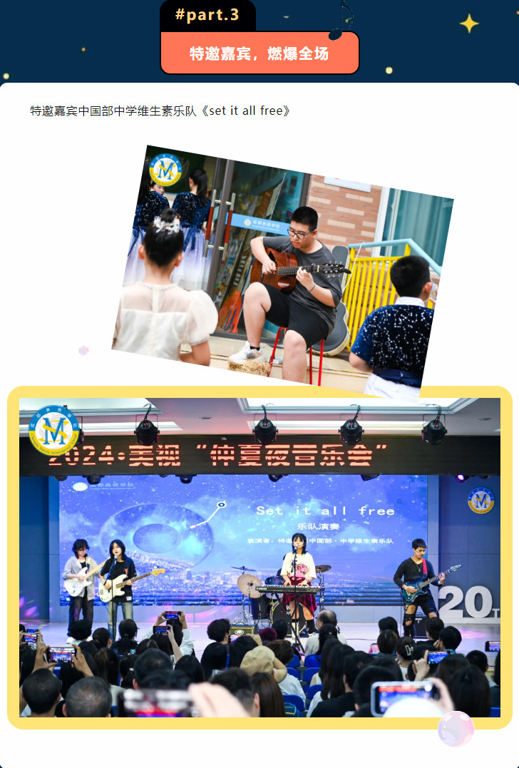跳动的音符,装扮着美好的生活;优美的舞姿,闪烁着迷人的光辉。2024年6月仲夏之夜,美视星空艺术团、中国部小学和中国部中学的师生与家长们欢聚一堂,一起享受音乐的魅力、感受舞台的激情!