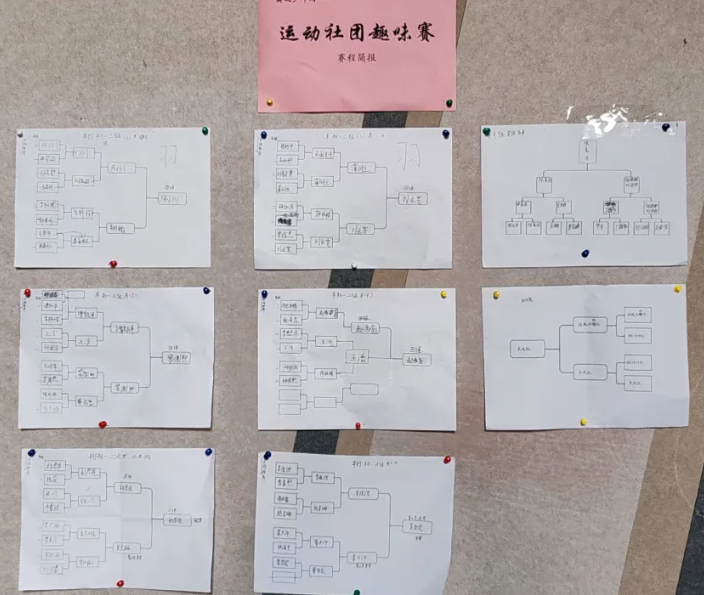 羽毛球社、乒乓球社、排球社三大运动社团率先点燃竞技热情。从集体报名的火热现场到持续两周的激烈角逐,社长们实时更新的赛程流程图见证着每个精彩瞬间。