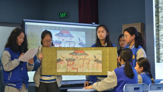 第二堂课是跨学科展示,由7年级美术、历史老师与同学们呈现探究唐朝之美的一部分过程。本节课关注重大概念:交流,同学们通过了唐朝文化交流的例子,探究唐朝文化在输入和输出方面的表现。老师从有趣的各朝代服饰、诗歌、文物选择游戏入手,带领学生分析唐朝文化的特点,探究唐朝文化输入与输出在历史上的各种表现,并请同学们基于文化输入的诸多元素创造出唐朝文化美术作品,在小组创作中结合历史与美术的知识和能力,探究大唐文化之美。