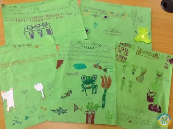 美术课上,我们分小组编故事,绘故事,设计个性封面和封底,整理成书。精彩绝伦的美术作品是孩子们最好的礼物;