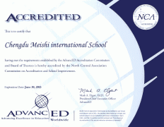 热烈祝贺我校通过世界先进教育促进组织(AdvancED)认证 兹证明: 成都美视师一学校已达到世界先进教育促进组织(AdvancED)认证委员会和董事会的要求,特此颁发由中北学校认证及促进联合委员......