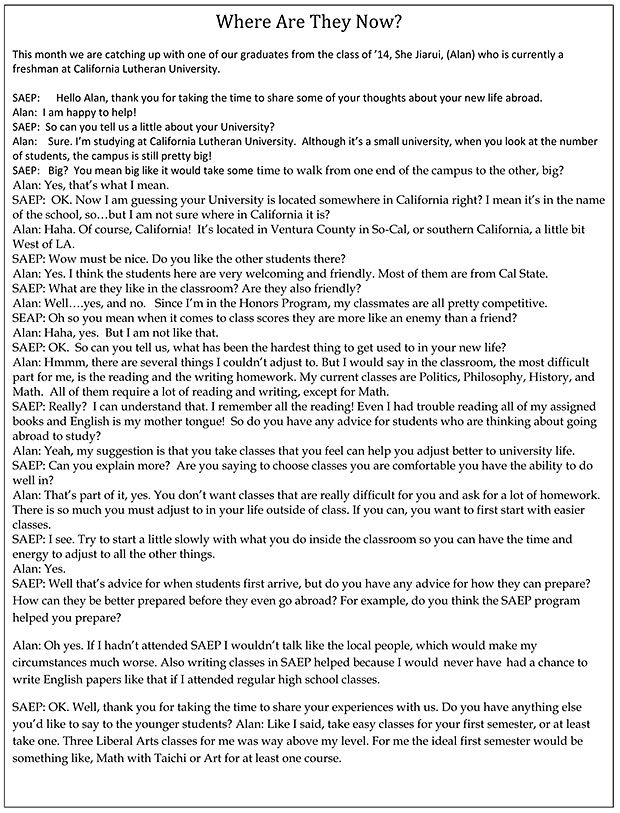 本月我们访问到了来自2014届的毕业生Alan佘家瑞,他现在是加州路德大学的一名大一新生。