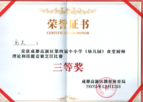 12月13日,成都市高新区第四届中小学(幼儿园)食堂厨师理论与技能竞赛圆满落幕。本次大赛汇聚了来自全区120余所学校的后勤精英,经过激烈角逐,共评出团体一等奖9名、二等奖12名、三等奖15名。